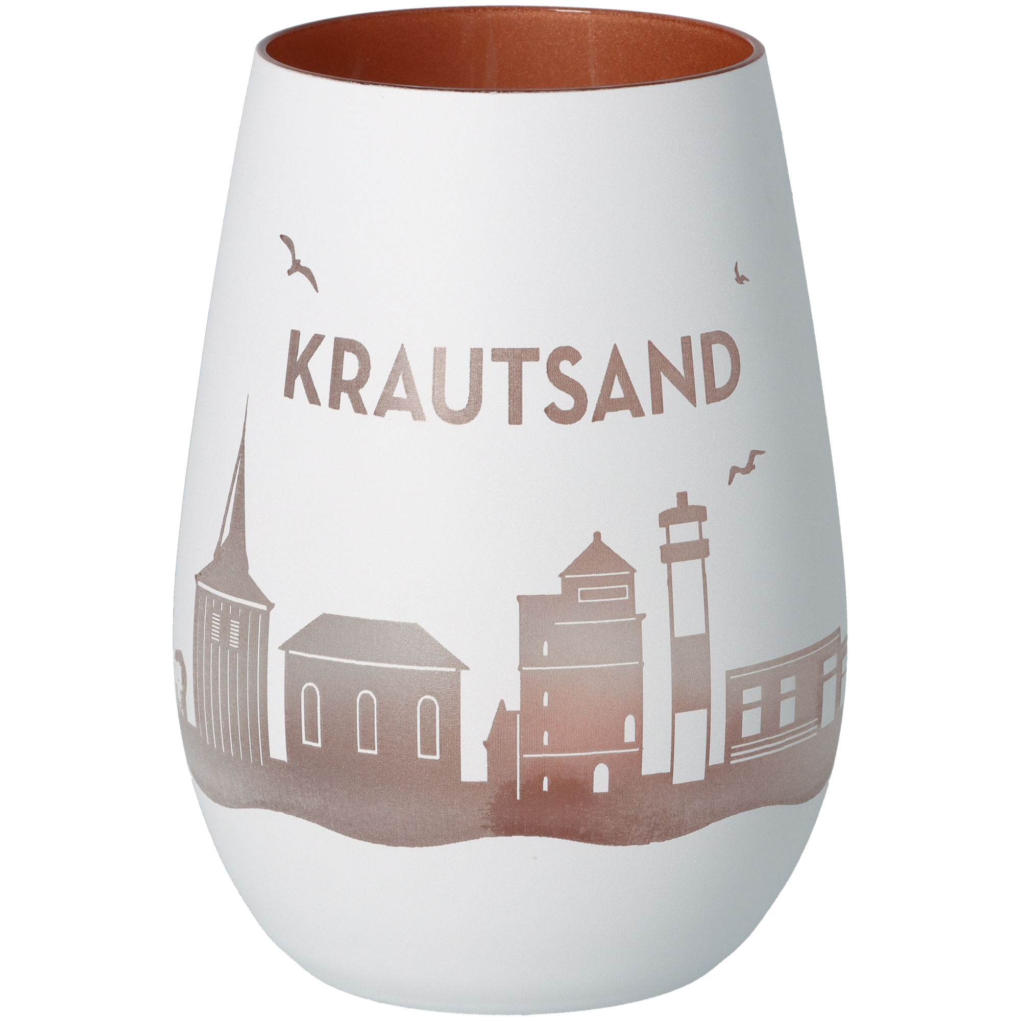 Die perfekte Geschenkidee ist unser Windlicht mit einer rundum Gravur von der Krautsand Skyline, welche mit Kerzenlicht extra heraussticht.