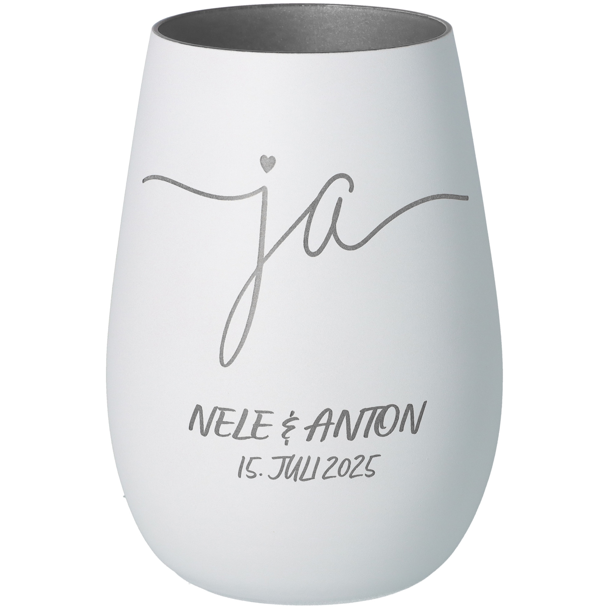 Ein wunderschönes Windlicht, das pure Romantik ausstrahlt! ????️ Das stilvolle Windlicht mit der Gravur „Ja“ ist das perfekte Geschenk zur Hochzeit. Mit den Namen des Brautpaares und dem Hochzeitsdatum personalisiert, wird es zu einem einzigartigen Erinnerungsstück an den großen Tag.